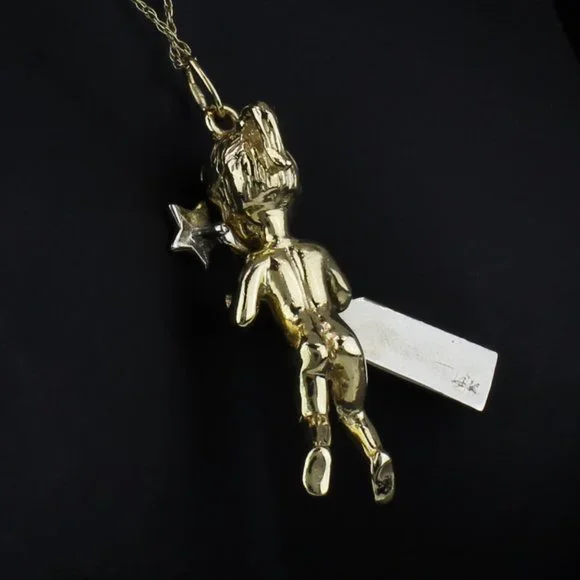 This pendant is made of 14 karat two tone gold and depicts a girl holding a star wand that is tagged reading, “A STAR IS BORN”. The wand contains a single round-cut diamond (0.02ct). “14K” is stamped onto the back of the tag. **NECKLACE NOT INCLUDED**Height: 38mm, with bailWeight: 5.74dwt/8.93gMetal: 14 karat yellow/white goldStone: Diamond (0.02ct)803385-17* e-896