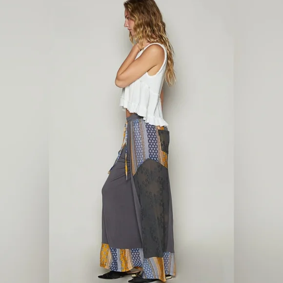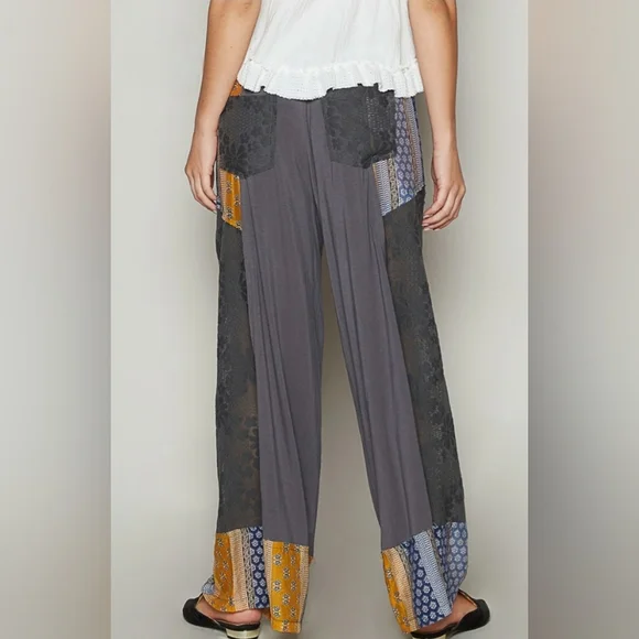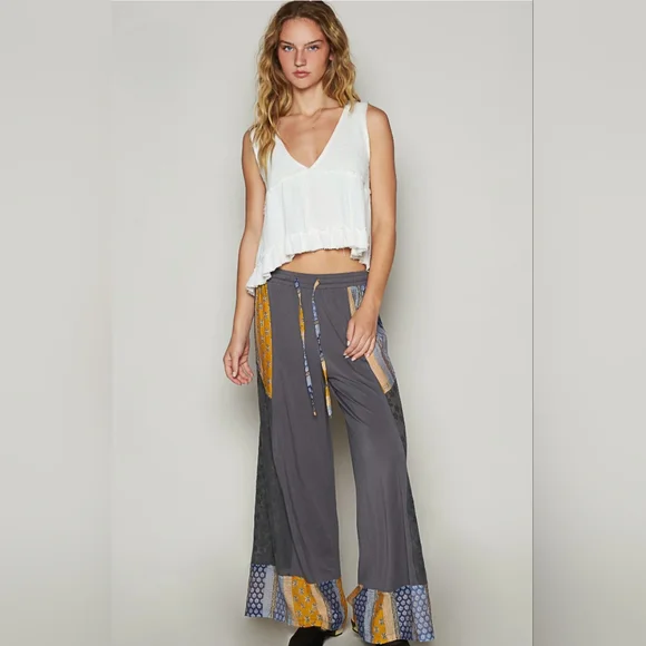 Designed in wide pants, relaxed fit in POL jersey and crochet lace mix with floral printed detail pointed solid pattern.--------------------------------------------------------------------------Fabric Contents:- SELF: 94% RAYON 6% SPANDEX- CONTRAST: 100% POLYESTER--------------------------------------------------------------------------Specs/Dimensions:- WAIST : 13"- RISE (included band) (front) : 11-3/4"- RISE (back) : 14-1/2"- LEG OPENING : 14-3/4"