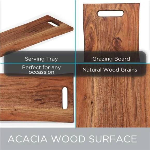 🧿BEAUTIFUL SERVING BOARD: Add elegance to your table or kitchen countertop with this handcrafted acacia wood charcuterie board, ideal for serving cheese, meat, veggies, dips, and more at your next party or family gathering.🧿UNIQUELY CRAFTED: Handcrafted from solid acacia wood, each board features distinctive wood grain patterns, ensuring that every piece is unique and adds a natural, elegant touch to any setting.🧿DURABLE NATURAL TOUCH: The durable construction of this wooden serving tray provides a sturdy and long-lasting option for serving food. Unlike glass dishes, it can withstand drops and daily use. Dimensions: 27.5" (L) x 8" (W) x 0.6" (H) 3.57 lbs🧿FOOD SAFETY AND VERSATILE: Acacia wood resists moisture and is ideal for serving a variety of foods. Use it for bread, cheese, fruits, and appetizers both indoors and outdoors, enhancing any dining experience.