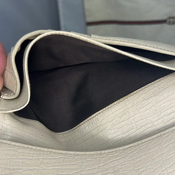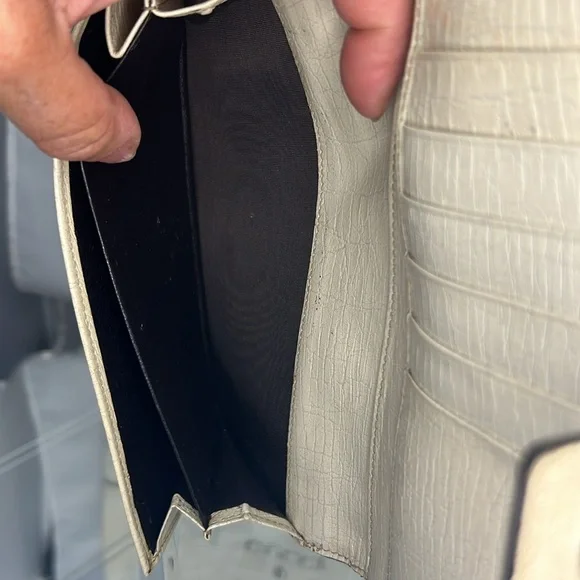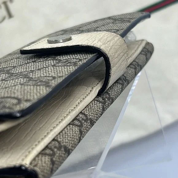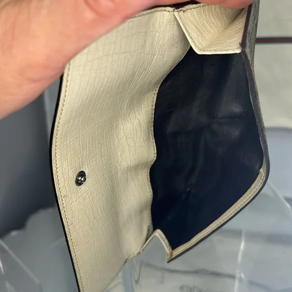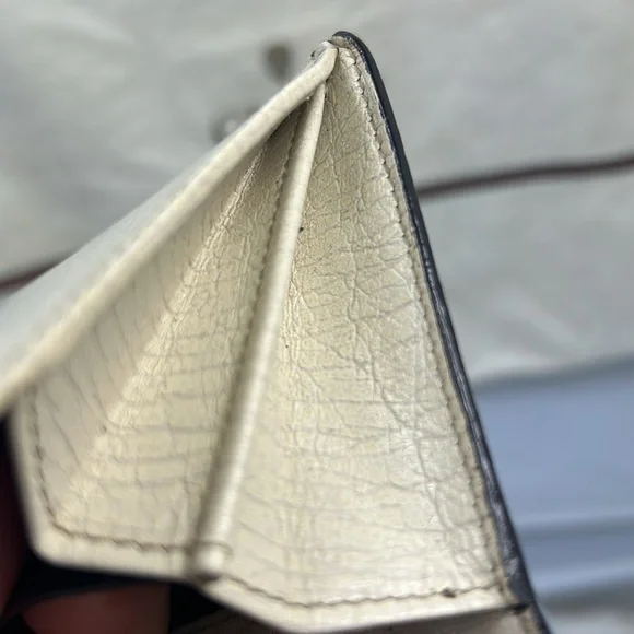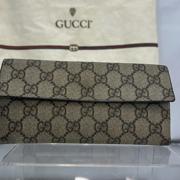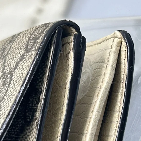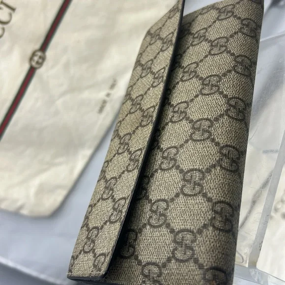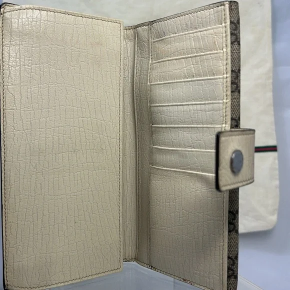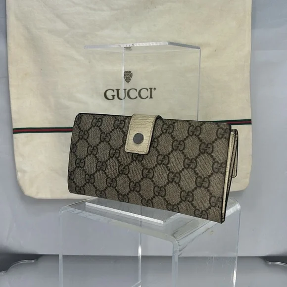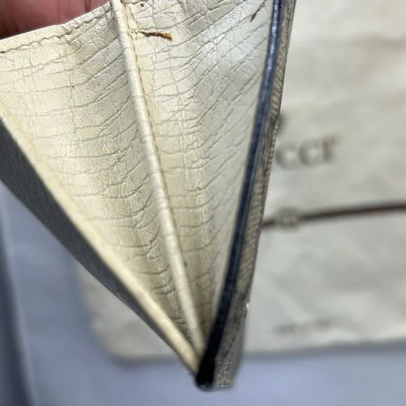 AUTHENTIC Gucci Bifold Canvas Continental.This wallet/billfold, wallet is monogram embossed leather.Double Snap to open an Ivory color, with plenty of pockets and bill pocket, flap, cards compartments.Two edges have same wear,and minor and brown spots on exterior, scratches on the hardware.Overall it’s a great looking clean wallet. It’s a vintage item. W7.5xH4”approxOverall it’s a pretty- love but not perfect.Please see photos gallery before your purchaseSave your time no lower balling price.Question? comment below Thank you for visiting us