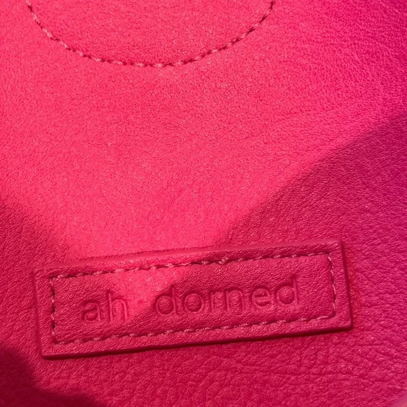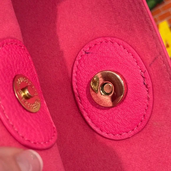 Vegan Leather Messenger in hot pink and gold hardware. Pickle ball wide strap9.5" H x 8.5" W x 2" D.Features snap closure main bag and one outside open pocket.Bag retails for $90Strap retails for $35Great condition. A light pen mark on front. And a mark by closure on inside of bag. See picsCross body, colorful, messenger bag, pickle ball, tennis, paddle, multicolor, sporty, leather, vegan leather
