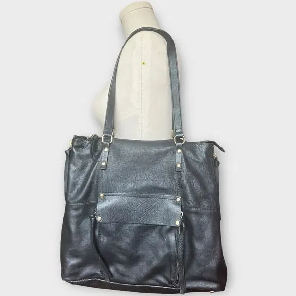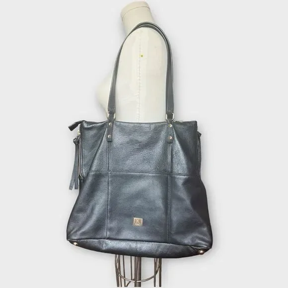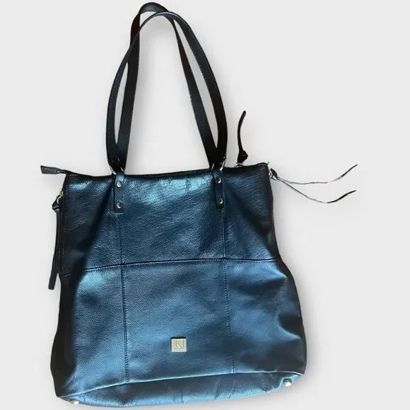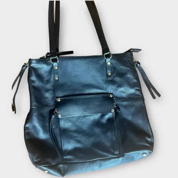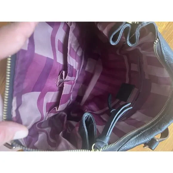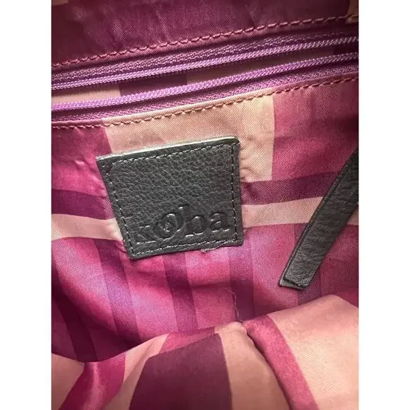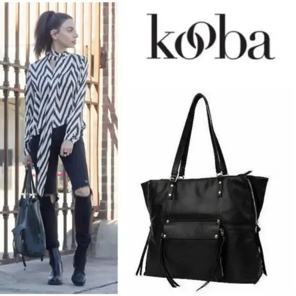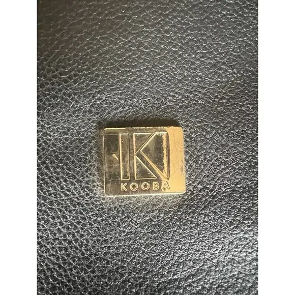 This KOOBA Everette shoulder bag is the perfect accessory for any occasion. With a large size and expandable design, it's ideal for travel, workwear, or casual use. The bag features a pebbled finish, brass hardware, and double handles for easy carrying. The bag has a zip closure and multiple pockets, including inner and outer pockets, all lined with purple/olive green fabric. It also includes bottom studs and a mobile phone pocket, making it a practical and stylish choice. The bag is made of soft black leather and has a fabric lining. Condition is great with a tiny bit of wear on the bottom studs and the slightest wear on the kooba logo hardware as pictured.