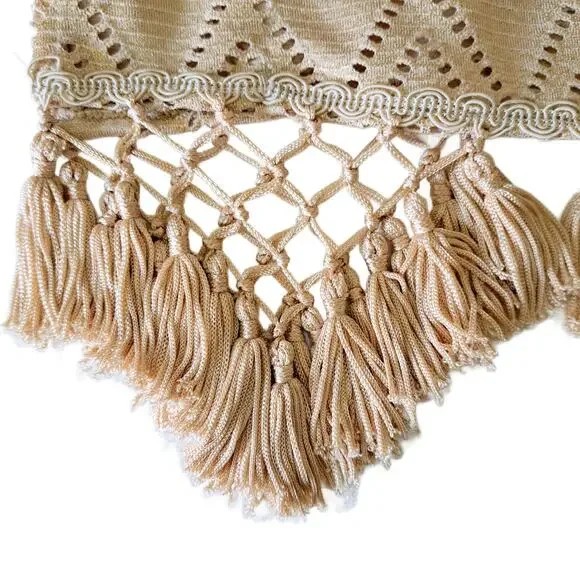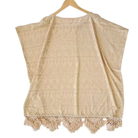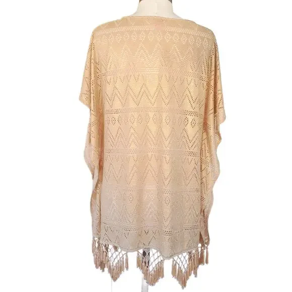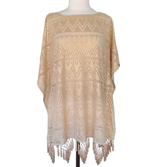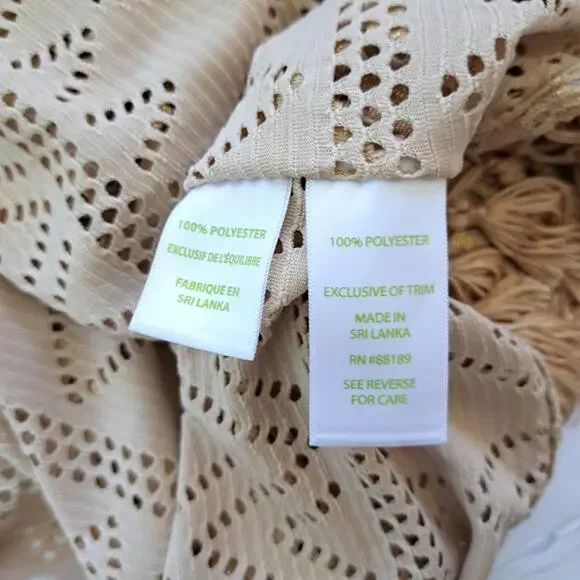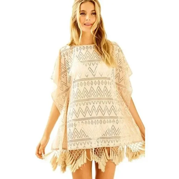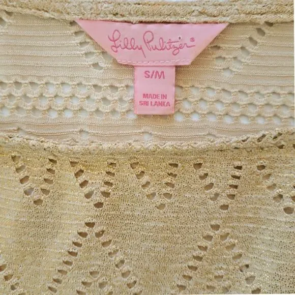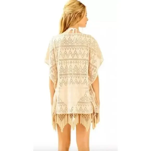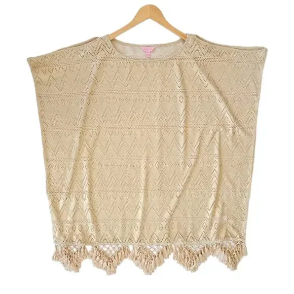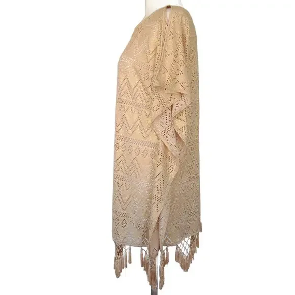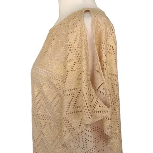 Jerrica Coverup In Sand Bar Sand Dune Gold Foiled Sparkling Sands Size Small/MediumThe Jerrica Coverup is split shoulder, unlined mini caftan cover-up with a tasseled hem and custom metallic lace. The look of glamourous luxury for a day of laying out by the pool. Polyester. Hand wash. Very good preowned condition - worn & washedonce for my B-day! The tassels have "raw" ends so they can frey.Size Small / mediumApproximate Lay Flat Measurements:Length 32"Armpit 21"Waist21"All photos without a model are of the actual item. Some may have been lightened to show detail. Shown on a size small dress form. Please compare provided approximate measurements to ensure the best fit. Any noted flaws have been described and photographed to the best of my abilities. Colors may vary between devices. No partial refunds. Feel free to ask questions before purchasing. I want you to LOVE your item ♥ Cheers!glam boho beachy resort cruise summer metallic sparkle tunic mini dress sheer honeymoon