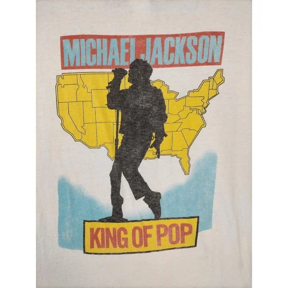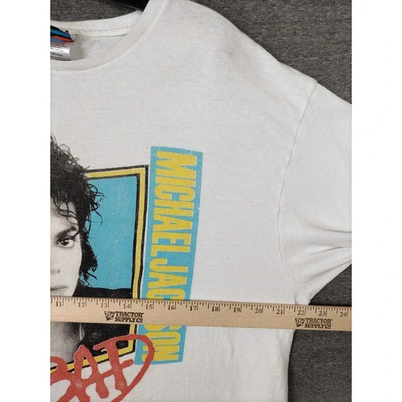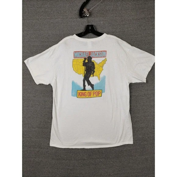 Michael Jackson Bad Shirt Mens Medium Large White King of Pop Tour TeeCondition: Good pre-owned condition, shows light wear consistent with age, no major flaws or stains visibleGraphic on front features iconic Michael Jackson portrait with 'Bad' album text and name, colorful 80s/90s styleBack print shows Michael Jackson silhouette with map of USA and 'King of Pop' textBrand: Junk Food TeesTag Size: M/L (Medium/Large)—please see flat measurements for best fitMaterial: 100% cottonMade in HondurasPit to pit approx: 22 inches; Length (shoulder to hem): 29 inchesClassic heavyweight feel, authentic Michael Jackson collectible shirt, great for fans or vintage pop culture collection
