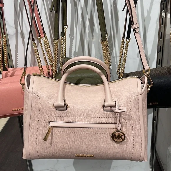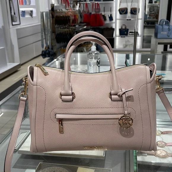 MICHAEL KORS Carine Large Pebbled Leather Top Zip SatchelPowder BlushNew with the tag authentic An instant icon: our sleek Carine satchel will go from day to night with ease, thanks to a generously sized interior with an array of pockets, structured top handles and a removable crossbody strap for varied carrying options. Crafted from pebbled leather with smooth trim, it’s a sophisticated touch to myriad looks. We love how the brand’s iconic “MK” charm lends a polished finish.Satchel Pebbled leather 100% leather Trim: 60% polyurethane/20% cotton/20% polyester Gold-tone hardware 13.5"W X 9.5"H X 6"D Adjustable strap: 21"-25" Exterior details: back zip pocket, front zip pocket, removeable strap Interior details: back slip pocket, front zip pocket Lining: 100% polyester Zip fastening Dust bag not included Imported
