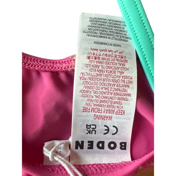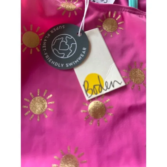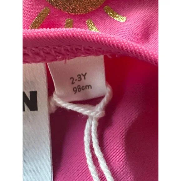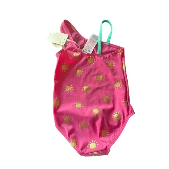 This stylish one-shoulder swimsuit features a vibrant pink design with gold sun prints. Designed for children aged 2-3 years, it offers a comfortable fit and durable material.• Made from planet-friendly materials• One-shoulder design with aqua strap• Gold sun print detailing• Secure and comfortable fit• Tag intact for authenticityTop to bottom = 18 inchesSide to side (waist) = 9 inches