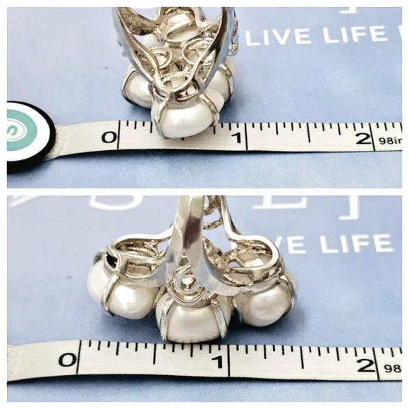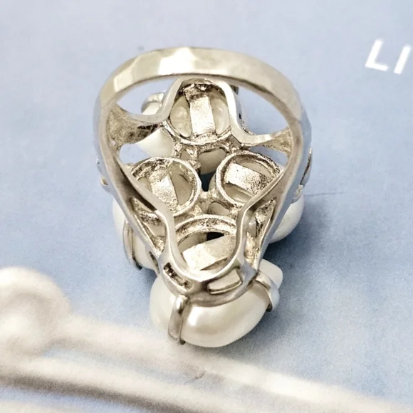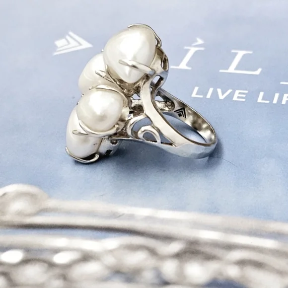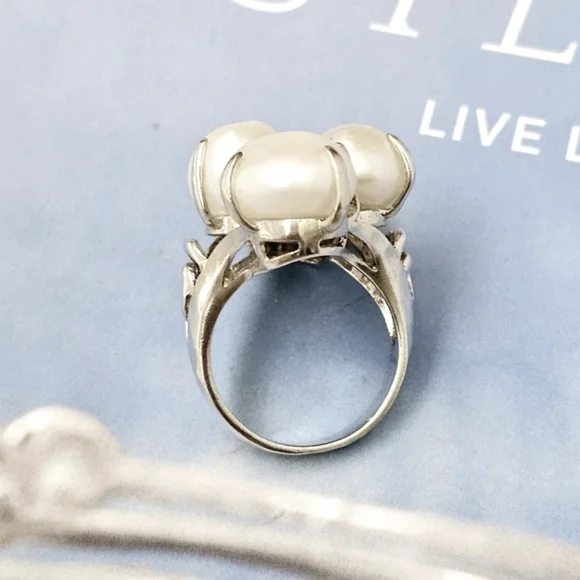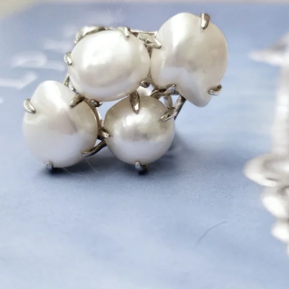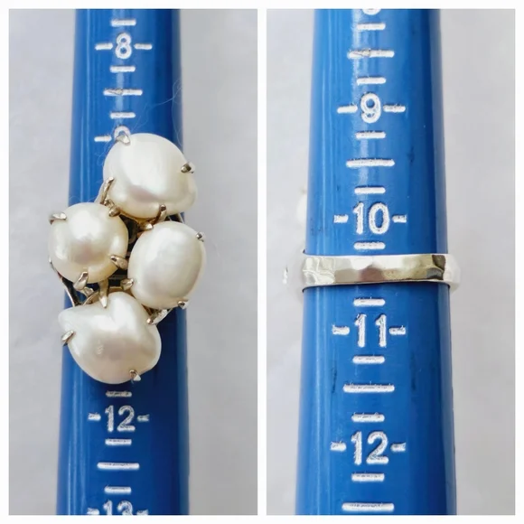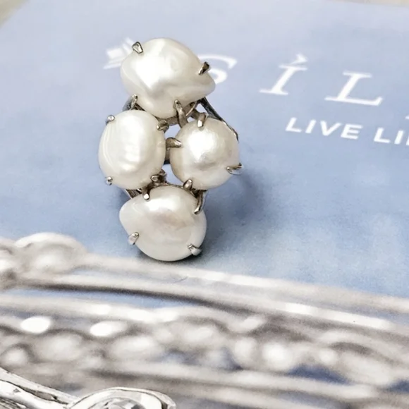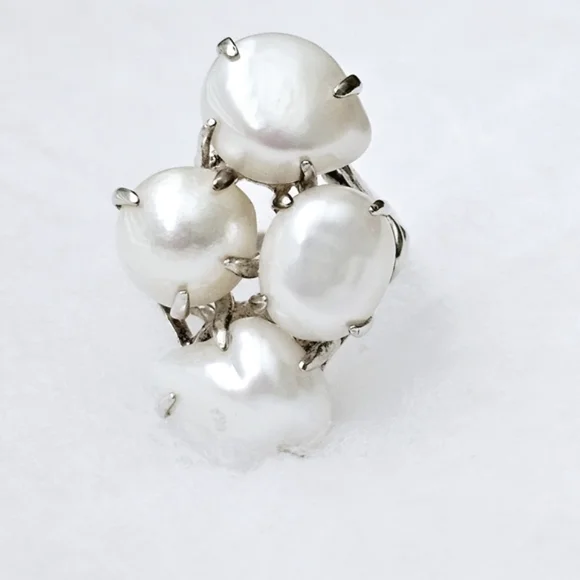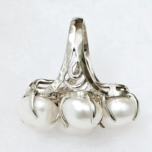 Super rare and HTF as this was only offered in one catalog. A stunning heirloom-quality piece that would be a gorgeous accessory for the bride. - 925 sterling silver band; slightly hammered- four large, chunky freshwater pearls in silver settings; each ring is unique, no two exactly alike- natural pearls will vary in color, shape and surface texture (ie:, rippling, indentations, reflections)- size approx 10.5 (see pics)Pristine!!!Please look at all non-stock photos as they are part of description. This is the item you will receive. Please ask all questions *before* purchasing.⚡️Fast Shipping⚡️⭐️ 5-Star Trusted Seller ⭐️❤️ 100+ Love Notes/Reviews ❤️📷 Items photographed during shipment. Clean, N/S home. Actual colors may vary.