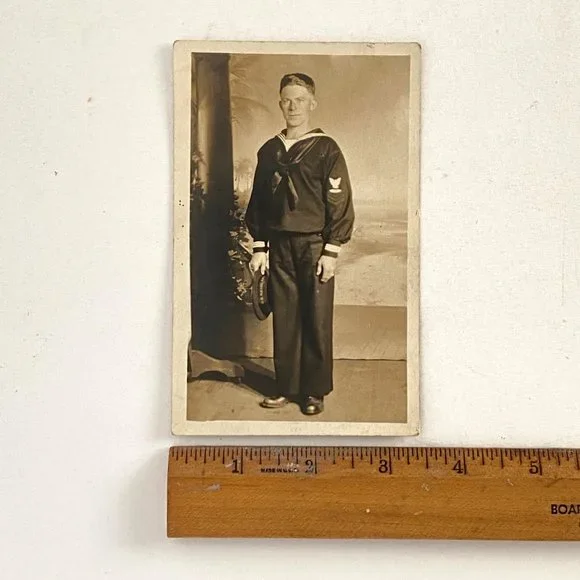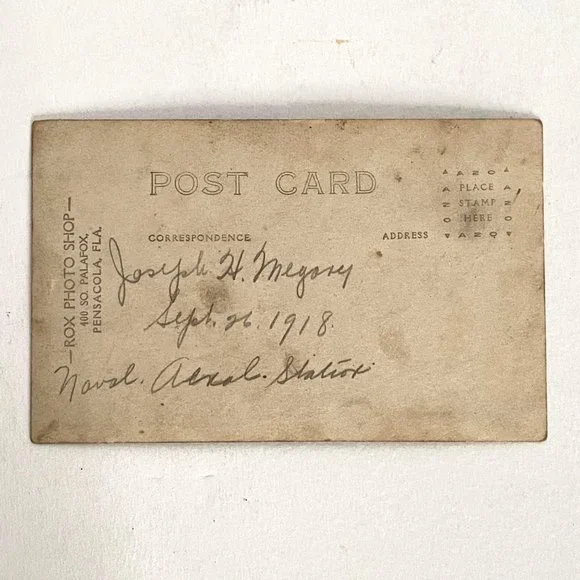 Real Photo Post Card (RPPC) WWI US Navy Sailor in Uniform and Holding a Hat that has US NAVAL A... On It Studio Portrait. Gelatin Silver AZO Divided Back Postcard Dated 1918. There is a Flash of Silver When Tipping the Photo.The back of the postcard has handwriting in pencil that says; Joseph H. Megany, Sept 26, 1918, Naval Aerol Station. Printed on the back it says; ROX PHOTO SHOP, 400 So. Palafox, Pensacola, Fla. (Florida).Likely this sailor was assigned to Pensacola Naval Air Station in Florida, which was built in 1913 and operational during World War 1.Measures approx 3 1/2 x 5 1/2 inches.This antique card is in good to fair condition. The edges and corners show light to moderate wear.Please take a look at the photos for details and feel free to ask questions. I'm happy to help! 🙂