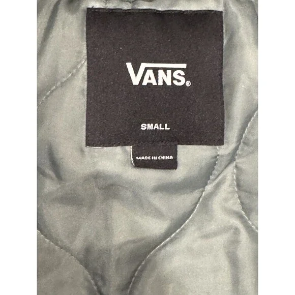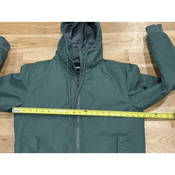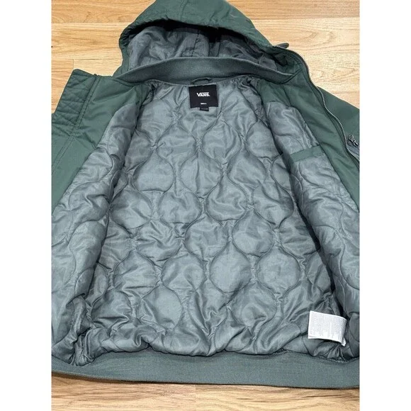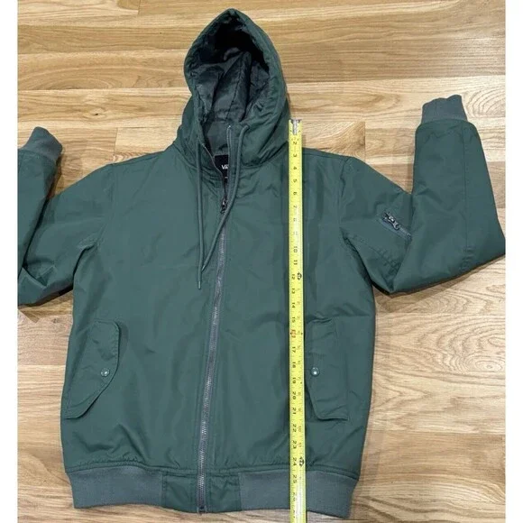 This is a Vans Men's Kilroy Mountain Jacket in size Small, featuring a green polyester outer shell with button and zipper accents. It is a bomber style jacket with a hood, full zip closure, and pockets. The jacket is insulated with polyester and suitable for activities like walking, cycling, hunting, and skateboarding.