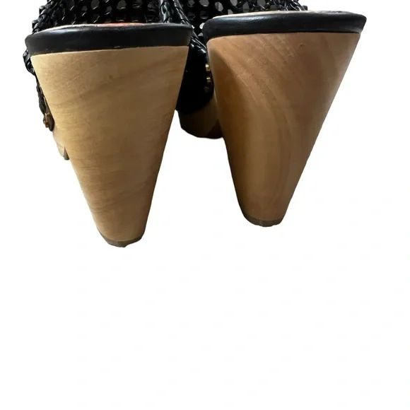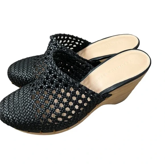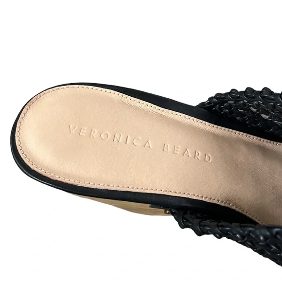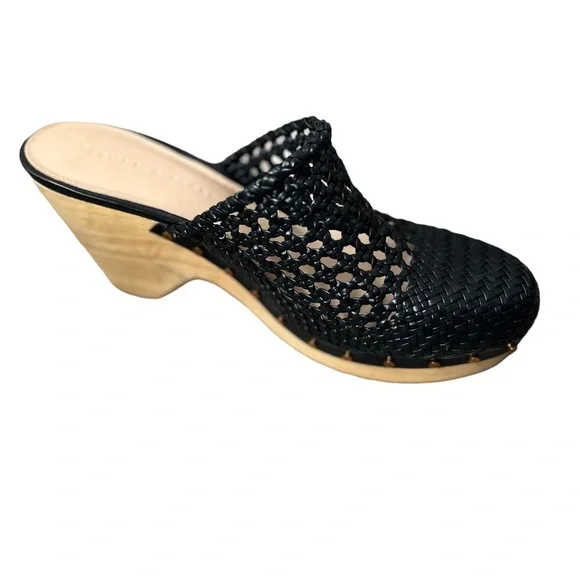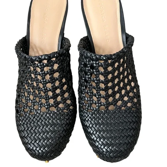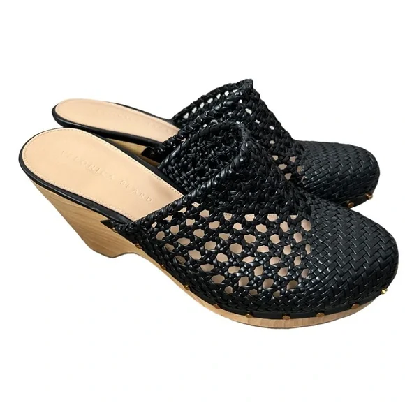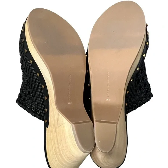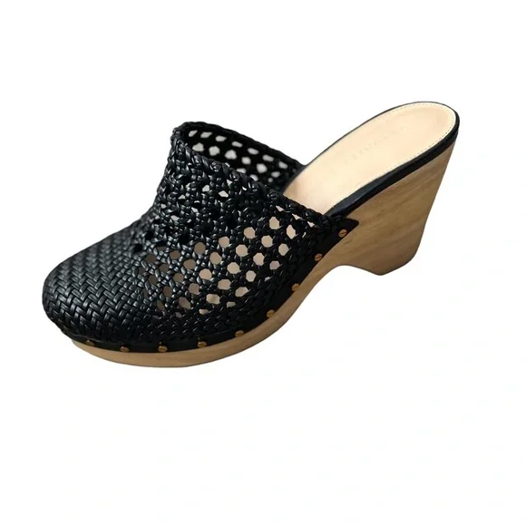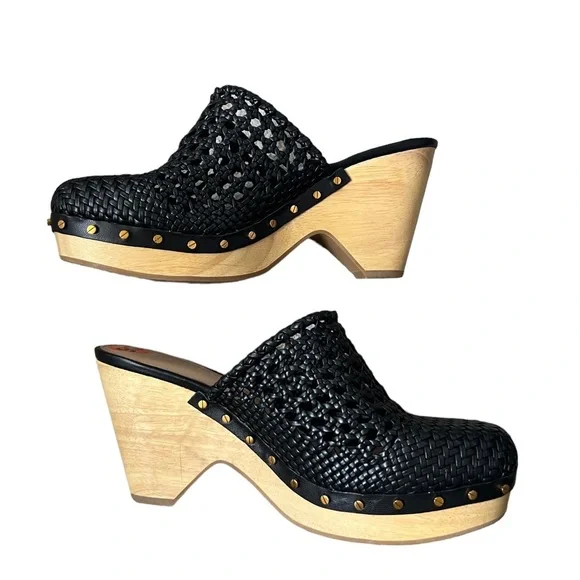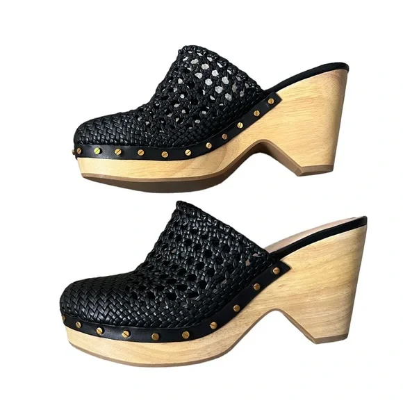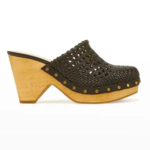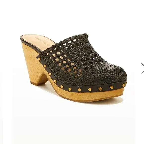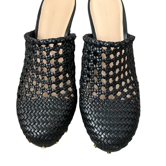 Veronica Beard Hardie Woven Leather Mule Clogs With Stud Trim Black NWOT Size 9.5New without tags - pristine condition Style #I2289L1Size 9.5BlackWith a perforated leather upper, the Hardie is a fashion-forward take on the must-have clog. Studded trims and a mid-height heel complete the look of this everyday style. Wear with pants, jeans, dresses—you name it.Heel height 2 1/2"Round toeSlide styleRubber outsoleLining: 100% Leather* please note natural lines in the wood as shown
