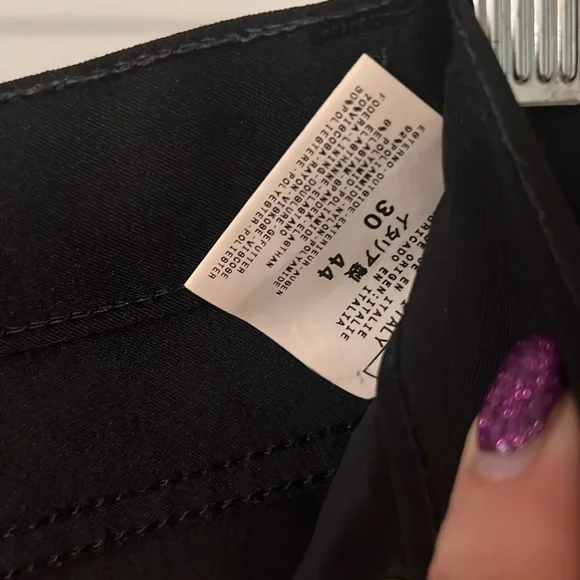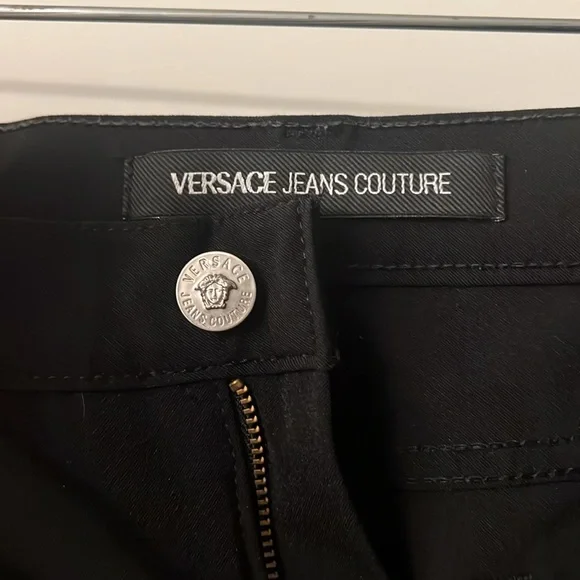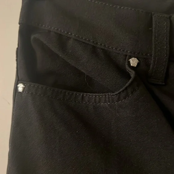 Preowned Excellent used condition Made in Italy15 in waist 35 in inseam 45 in length Faint marks on left pant legTags : going out , Italian , Versace Jean couture , Versace , cocktail , elegant wear, date night, workwear , vintage , goth , silver hardware This is a preowned vintage item please ask questions and manage your expectations before buying