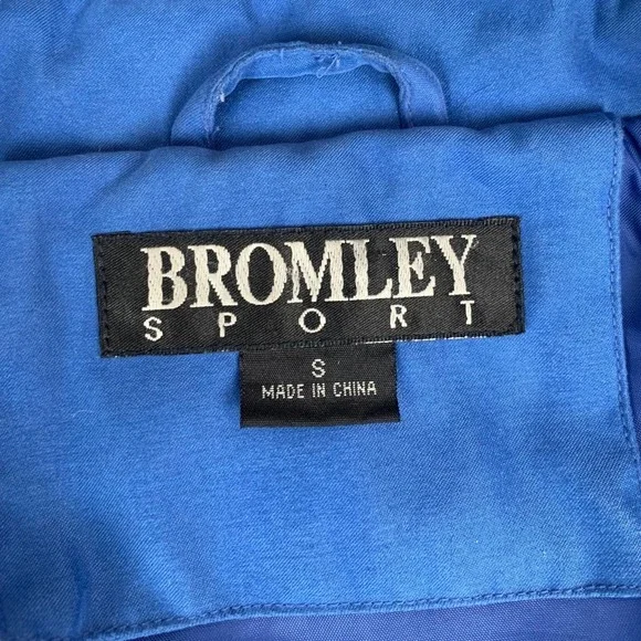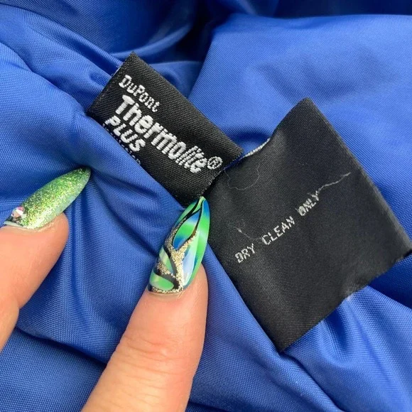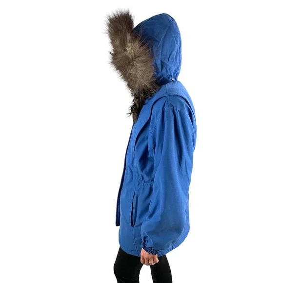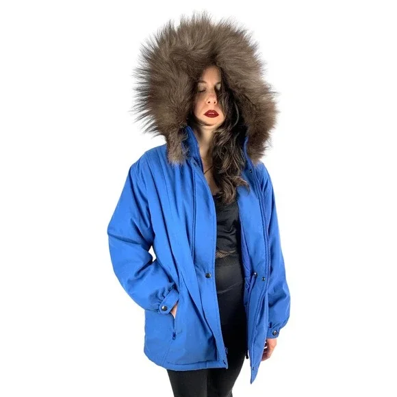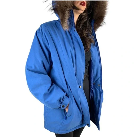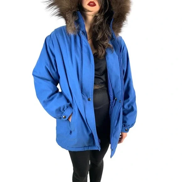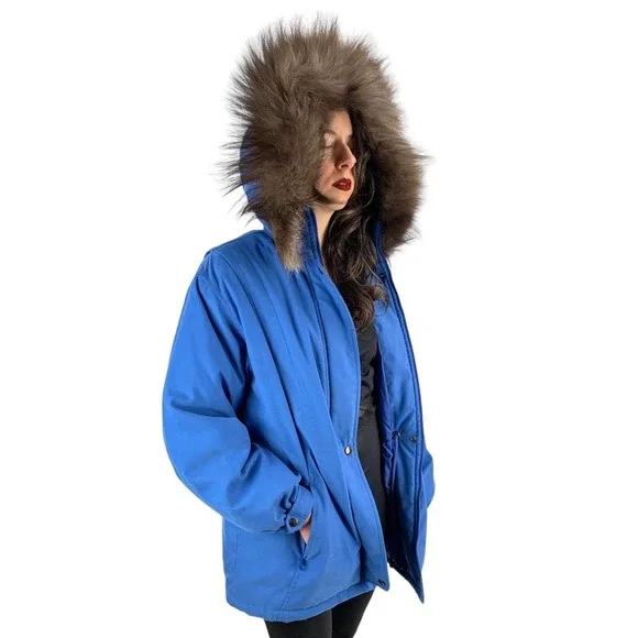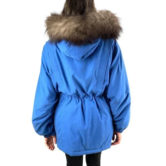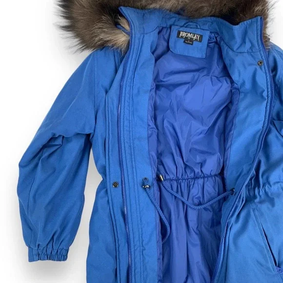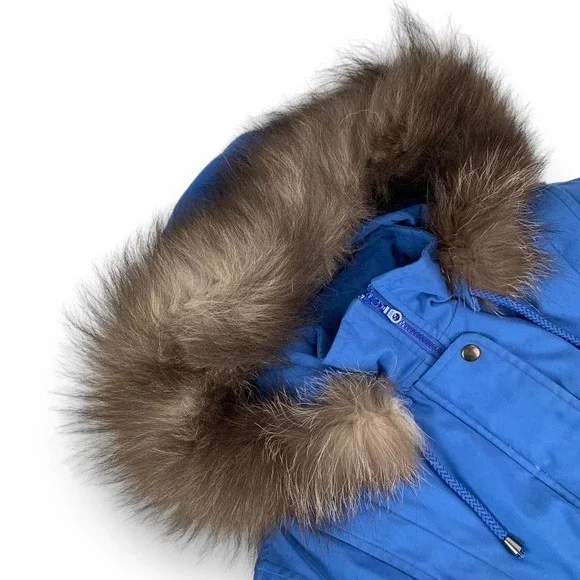 Vintage blue waterproof parka with large fox fur hood by BROMLEY SPORT. Waterproof microfiber polyester body with THERMOLITE PLUS insulation for added warmth. Zippers up the front with additional flap snap closure. Two large side pockets that zipper. Drawstring along waist and hood. Hood is removable. Marked size SMALL. Laying flat measures 20.5" across shoulders, 23.25" across underarms, 23" sleeves, 30.25" down the back, Excellent vintage condition, only small flaw to note is two small light colored spots along the front left bottom (see photos).