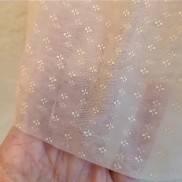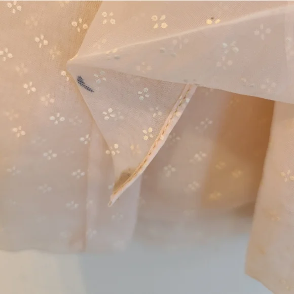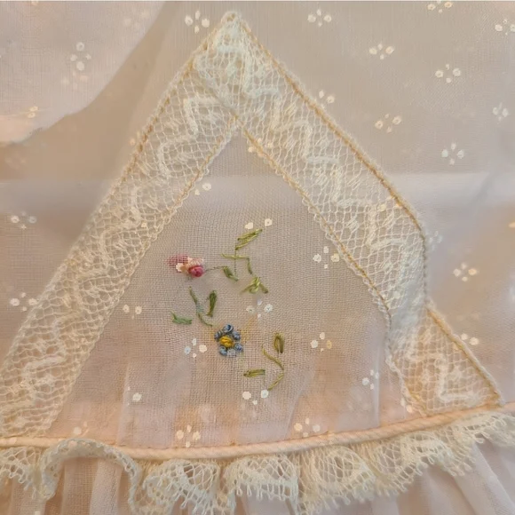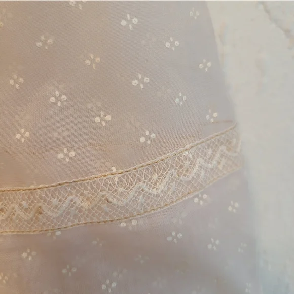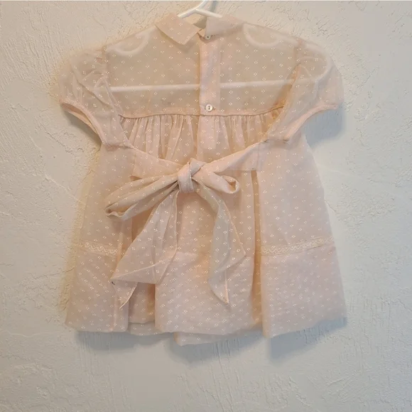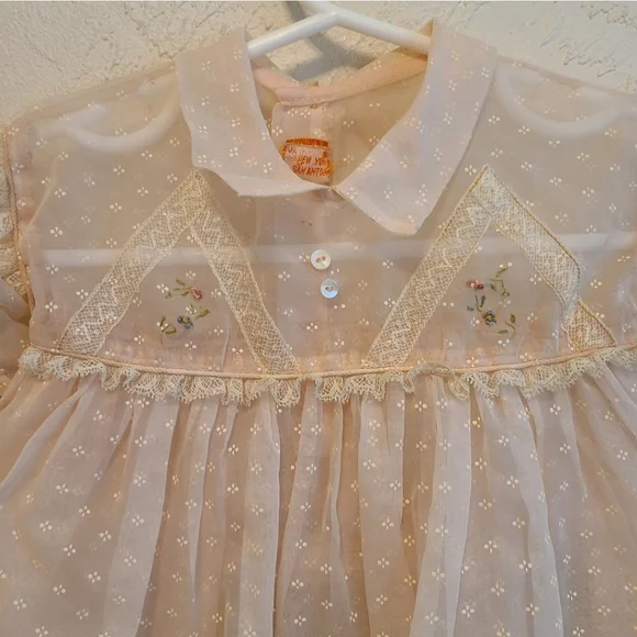 Brand: unable to determine-has a tag but it is unreadableFeatures: Rare sheer dress with no lining (would do well with a onesie underneath), attached sash, delicate embroidery, Swiss Dot, collar, and has been freshly laundered. Size: estimated to fit like a modern 6-12MModern size listed is an estimation, so please double-check measurements to ensure fit.Approx flat measurements:Pit to pit: 12"Length: 14"Condition: good vintage. May have minor overall wear consistent with the garments age. Perfect for parties, birthdays, holidays, family photos, school pictures, and baptisms. unique and ooak.*crossposted*