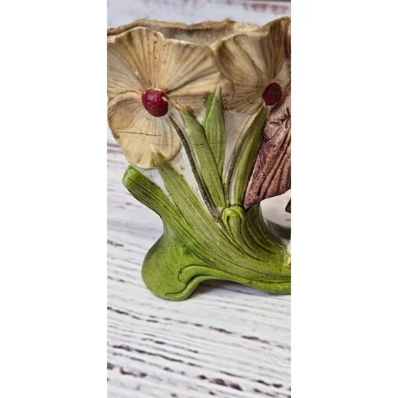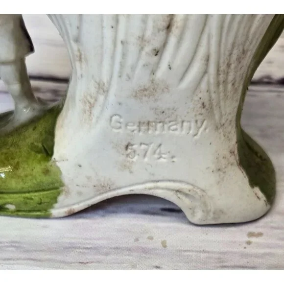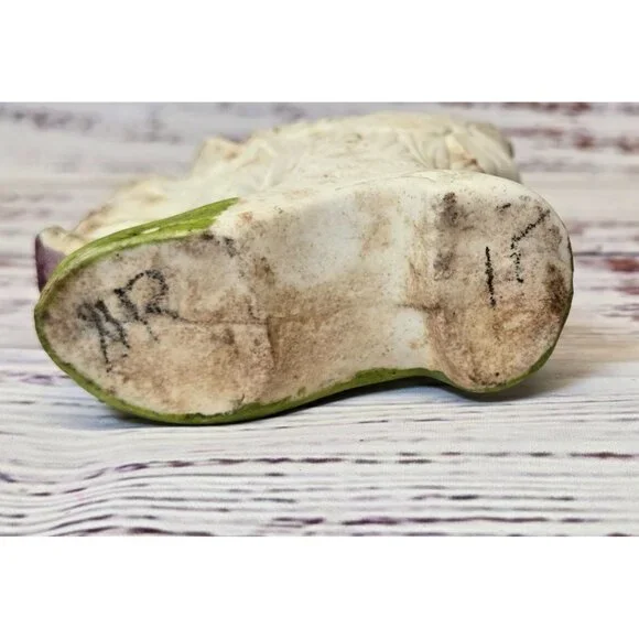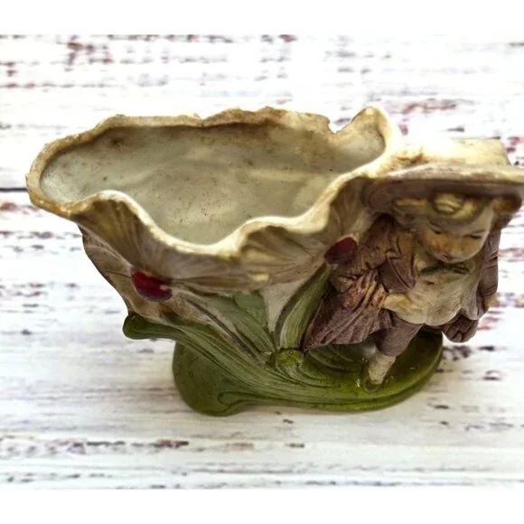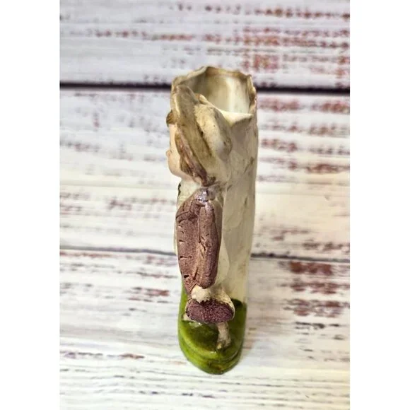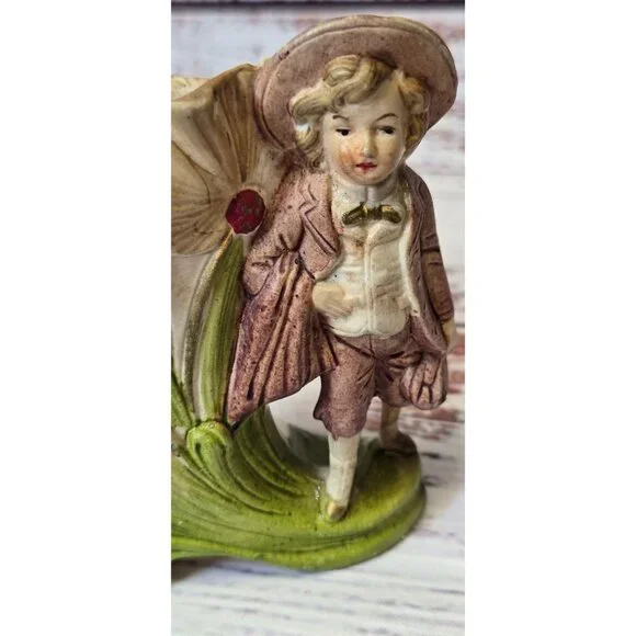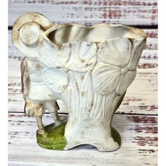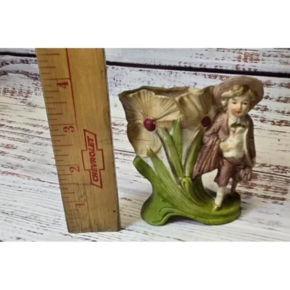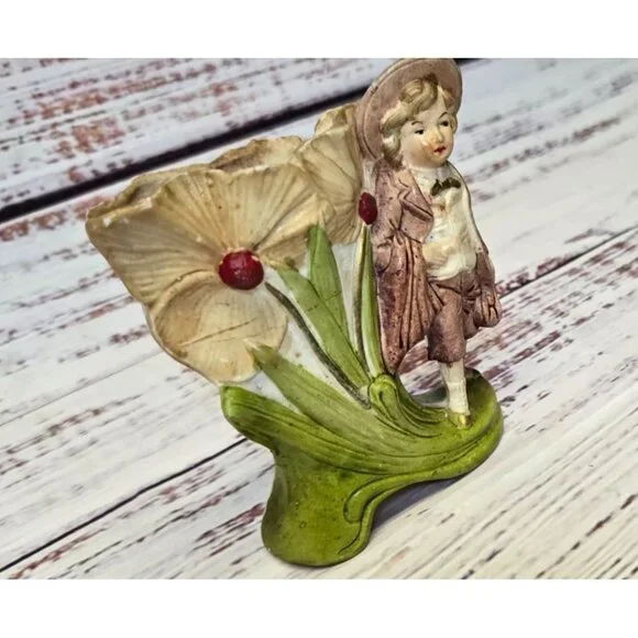 In the quiet corners of an old-world cottage, this delightful figurine stands as a testament to time. Crafted with care, the young boy's expression captures innocence amidst the blooms. German artisans have breathed life into each petal and fold, creating a charming piece that whispers stories of yesteryear.• Made in Germany• Vintage ceramic material• Intricate floral design• Height: 5.5 inchesSmall chip on the edge of the hat.